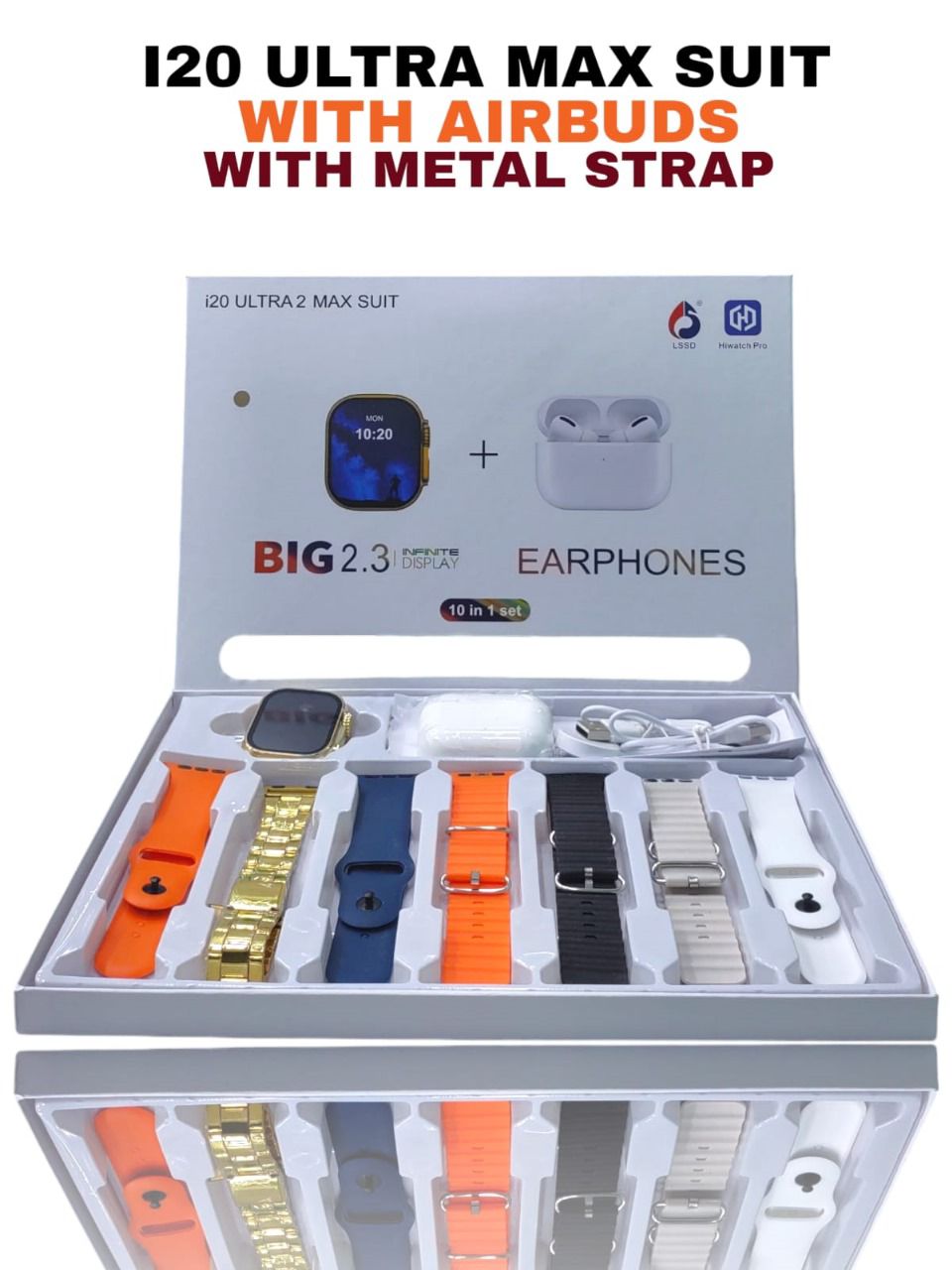 Product details of Orignal i20 Ultra Max Suit Smart Watch For Boys Girls Men Women 10 in 1 Box 2.3inch Large Screen Display 7 Straps in 1 Smart Watch with Earbuds Multi sport Waterproof Sleeping Call Heartbeat Rate Monitoring