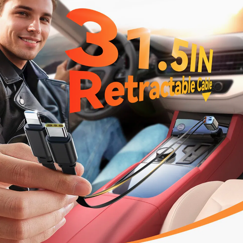4 in 1 Charging Solution: Features a retractable dual-line design with Type-C and 8-pin connectors, plus two additional USB ports for versatile charging options