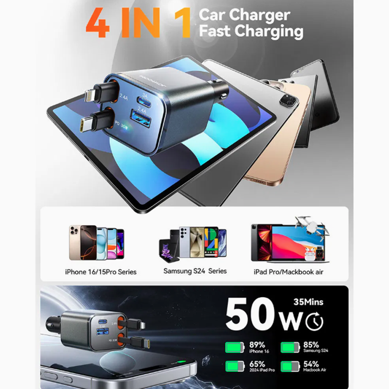 Joyroom JR-CCL05 50W 4-in-1 Retractable Car Charger-Dark Grey